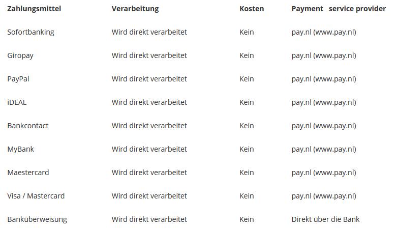 Wir streben danach, Ihre Bestellung am selben Tag zu versenden, an dem Q24U Ihre Zahlung erhalten hat. Sie können eine der diversen Zahlungsmöglichkeiten auswählen, die unten in der Übersicht aufgeführt werden. Hier werden auch eventuelle Kosten aufgelistet. Es wird angegeben, welcher Payment-Service-Provider die Zahlung durchführt.
